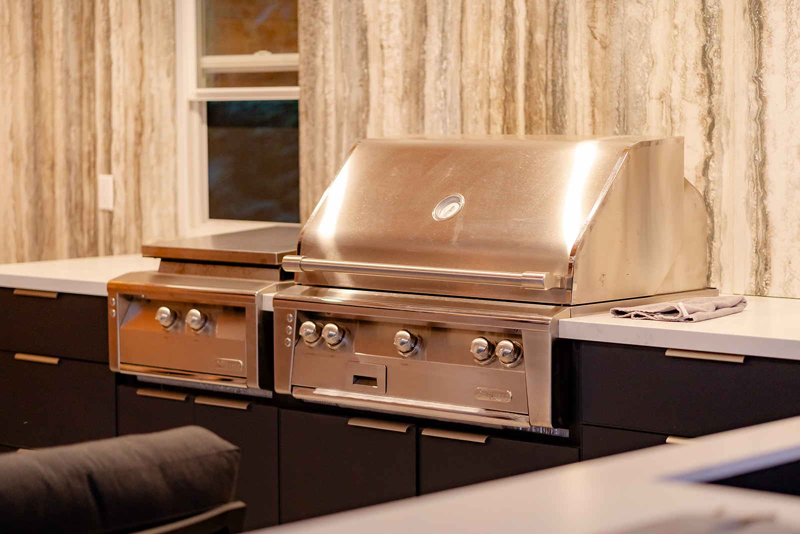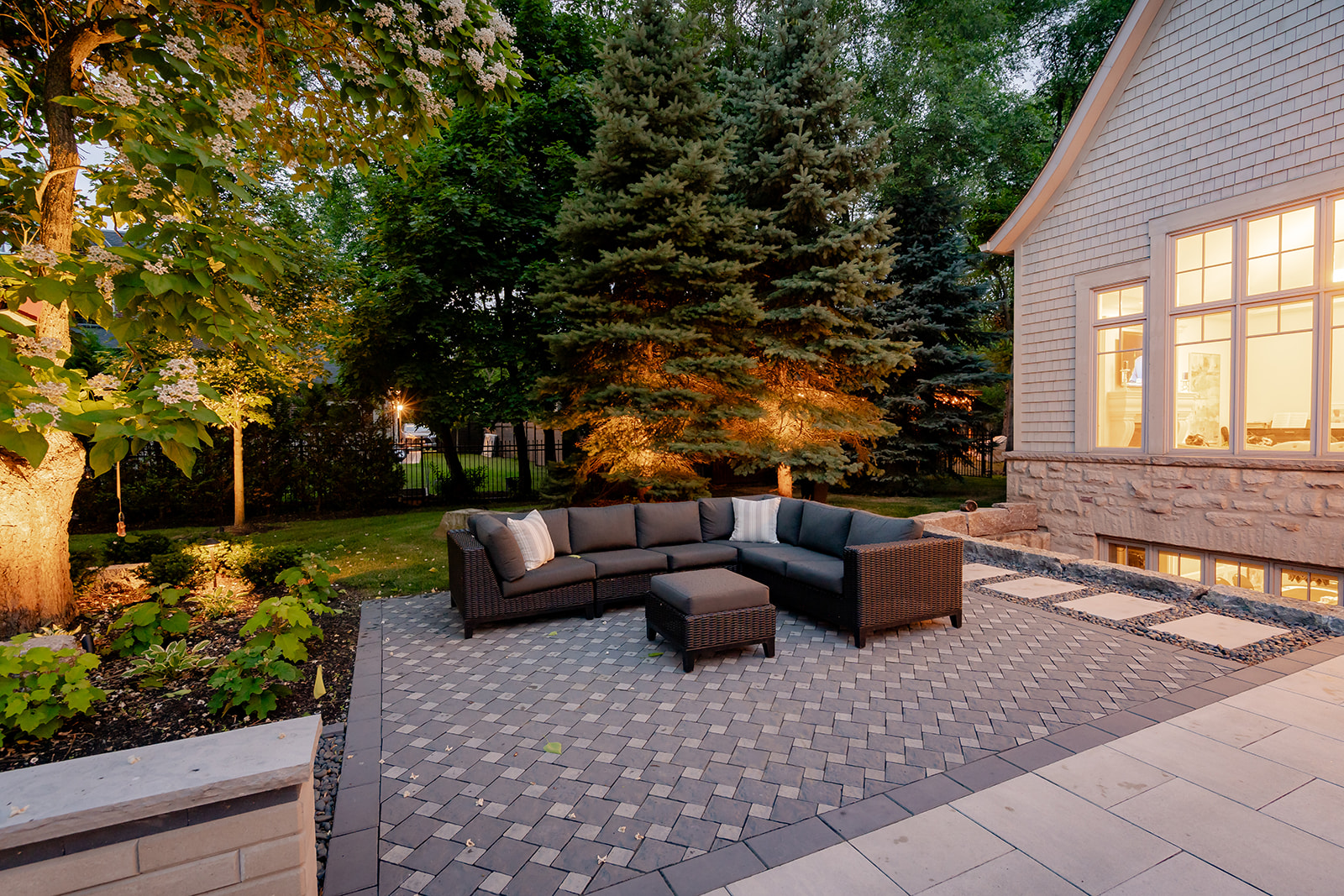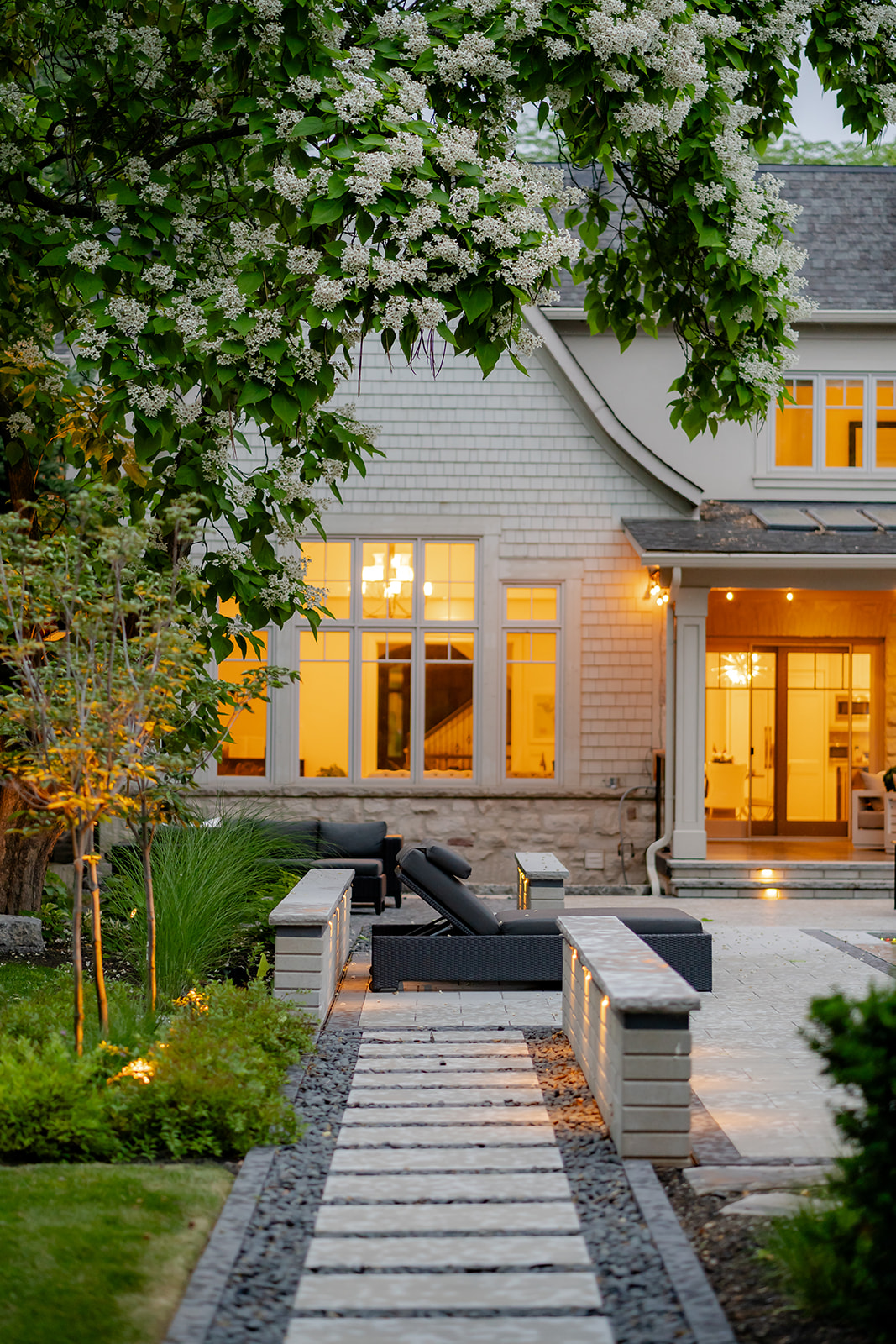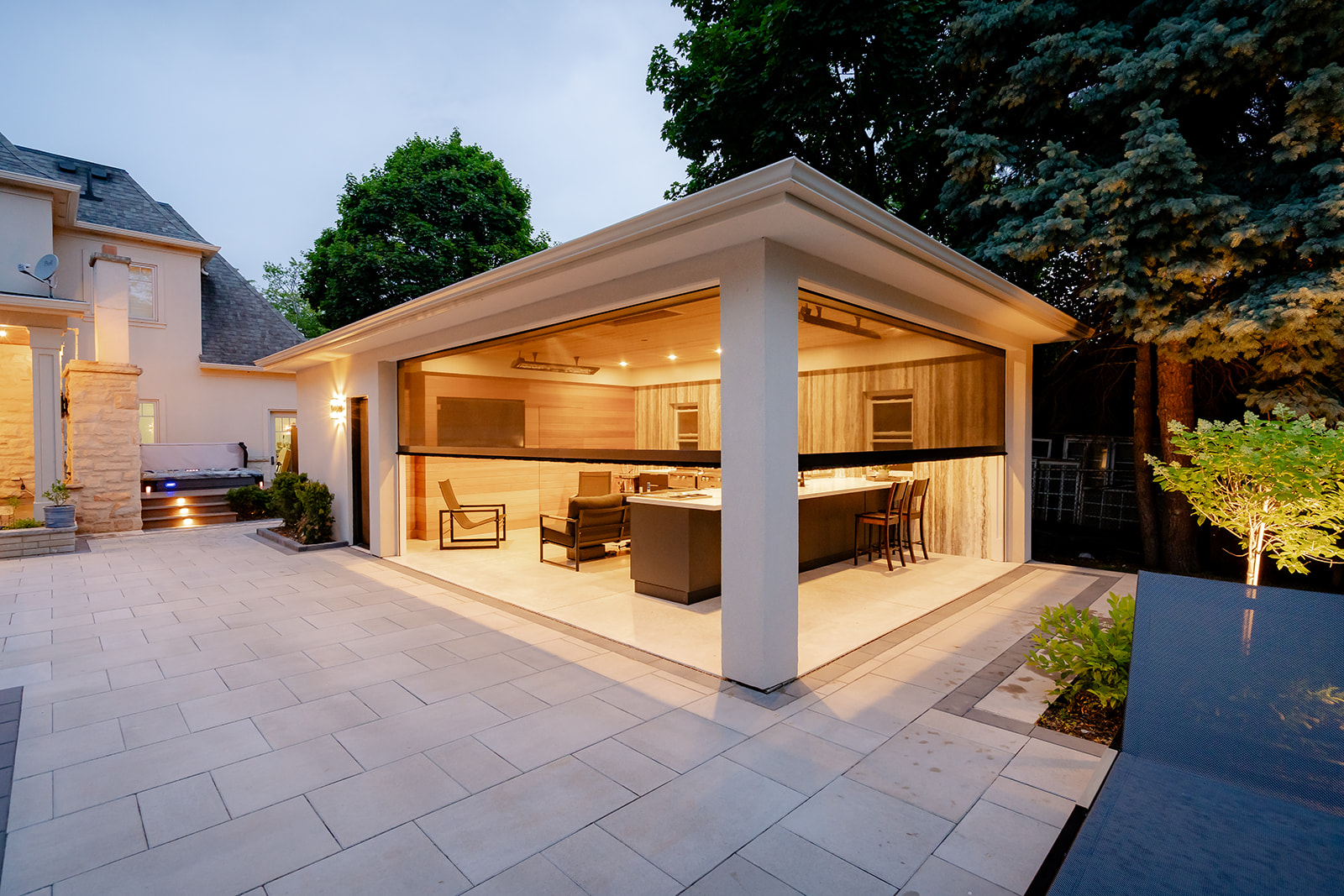 This project was situated in South Oakville and showcased a spacious backyard that was being transformed into a luxurious home resort. The main attractions included a swimming pool with unique custom-built stairs and tanning shelves. Additionally, there was a large cabana featuring a high-end kitchen, ample covered seating, and a lounge area. The cabana also provided guests with a private change area and bathroom. The backyard boasted an expansive hardscape area with various seating options, each adorned with gas fire features or umbrellas for shade. This backyard truly had everything, allowing the delighted family to enjoy a summer vacation right at home.